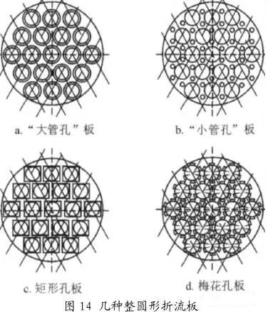 其中,傳統(tǒng)的管殼式換熱器殼程流體橫向沖刷管束傳熱效率較低,流動阻力大,常發(fā)生流體誘導振動而導致破壞。為解決換熱管束的振動問題,美國菲利浦石油公司在 20 世紀 70 年代開發(fā)了折流桿式換熱器,該換熱器不僅解決了振動問題,而且由于殼側(cè)流體的縱向流動使折流桿換熱器比傳統(tǒng)的弓形折流板換熱器傳熱系數(shù)提高 30%左右,殼程壓降減少 50%。由于流體在殼程中作縱向流動是管殼式換熱器中最理想的流動形式,因此近年來又開發(fā)出了一些新型縱流式換熱器,圖 14 中列舉了幾種常見的整圓形折流板,如矩形孔折流板,梅花孔折流板等。