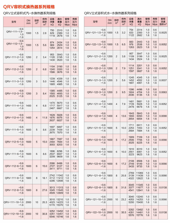 型號(hào)說明:舉例:QRV-112-5-1.0是立式湍流螺紋管容積式汽-水換熱器,多傳熱面積,容積5m3,公稱壓力1.0Mpa。